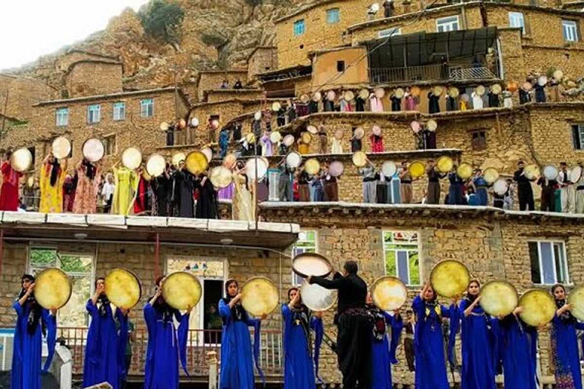 تصور کنید: صدها زن و مرد کُرد با لباسهای محلی رنگارنگ و فاخر، بر روی پشتبامهای پلکانی میایستند. همگی دف در دست دارند. با اشارهی رهبر گروه، نوای هماهنگ هزار دف در دره میپیچد. صدای کوبش دفها با صدای خروشان رودخانه تنگیور در هم میآمیزد و فضایی سرشار از ذکر و نیایش را خلق میکند. این مراسم اغلب با مولودیخوانی پیامبر اکرم (ص) همراه است و انرژی عظیمی را آزاد میکند که هر بینندهای را مسحور میسازد.